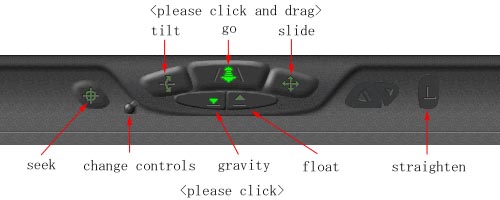 ![]() 1: For buttons tilt, go, and slide, click the button, then click and drag in the scene. 2: For button seek, ckick the button, then click the point in the scene, which you seek. 3: For buttons gravity, float, and straighten, instantly operate after click. 4: The button "change controls" changes the functions of tilt, go, and slide buttons to other functions.